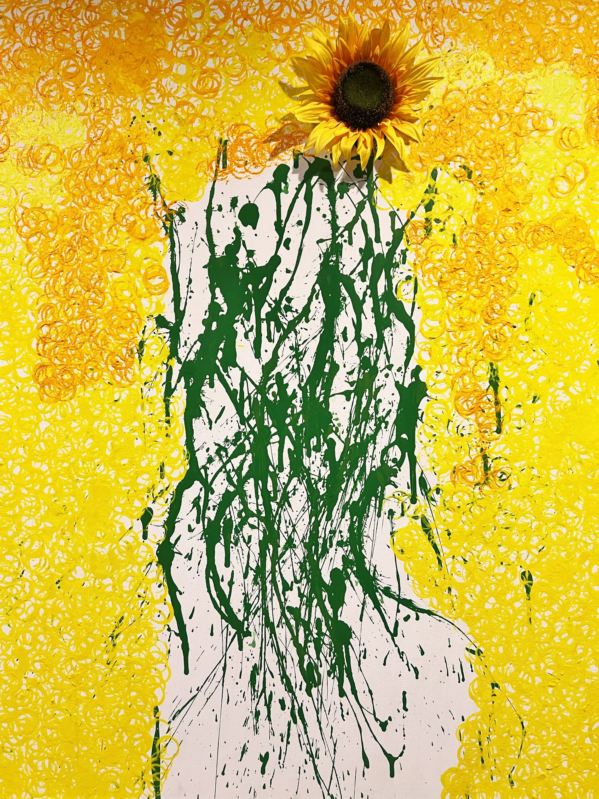 ● Medium/Materials: Acrylic paint on canvas with mixed-media sunflower element