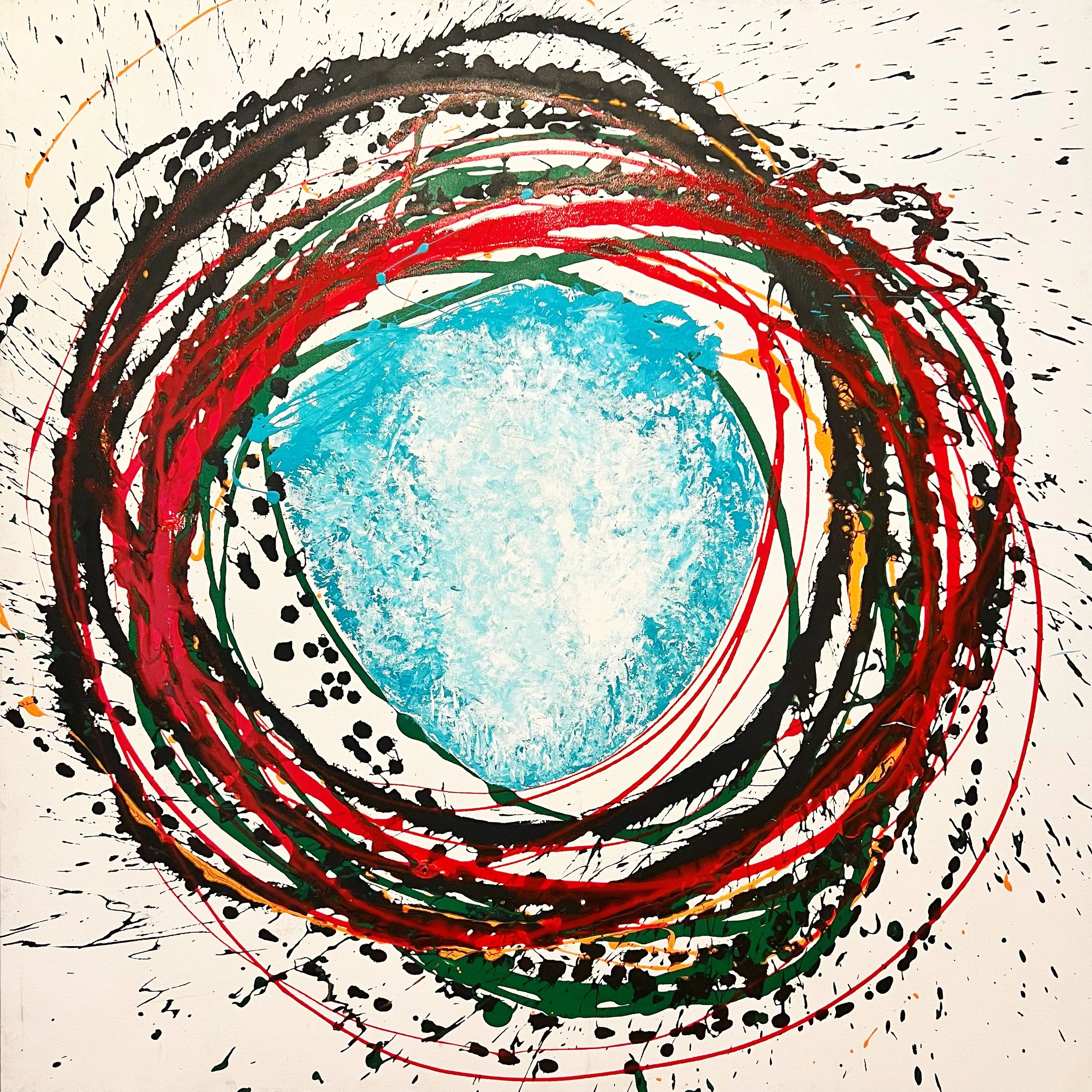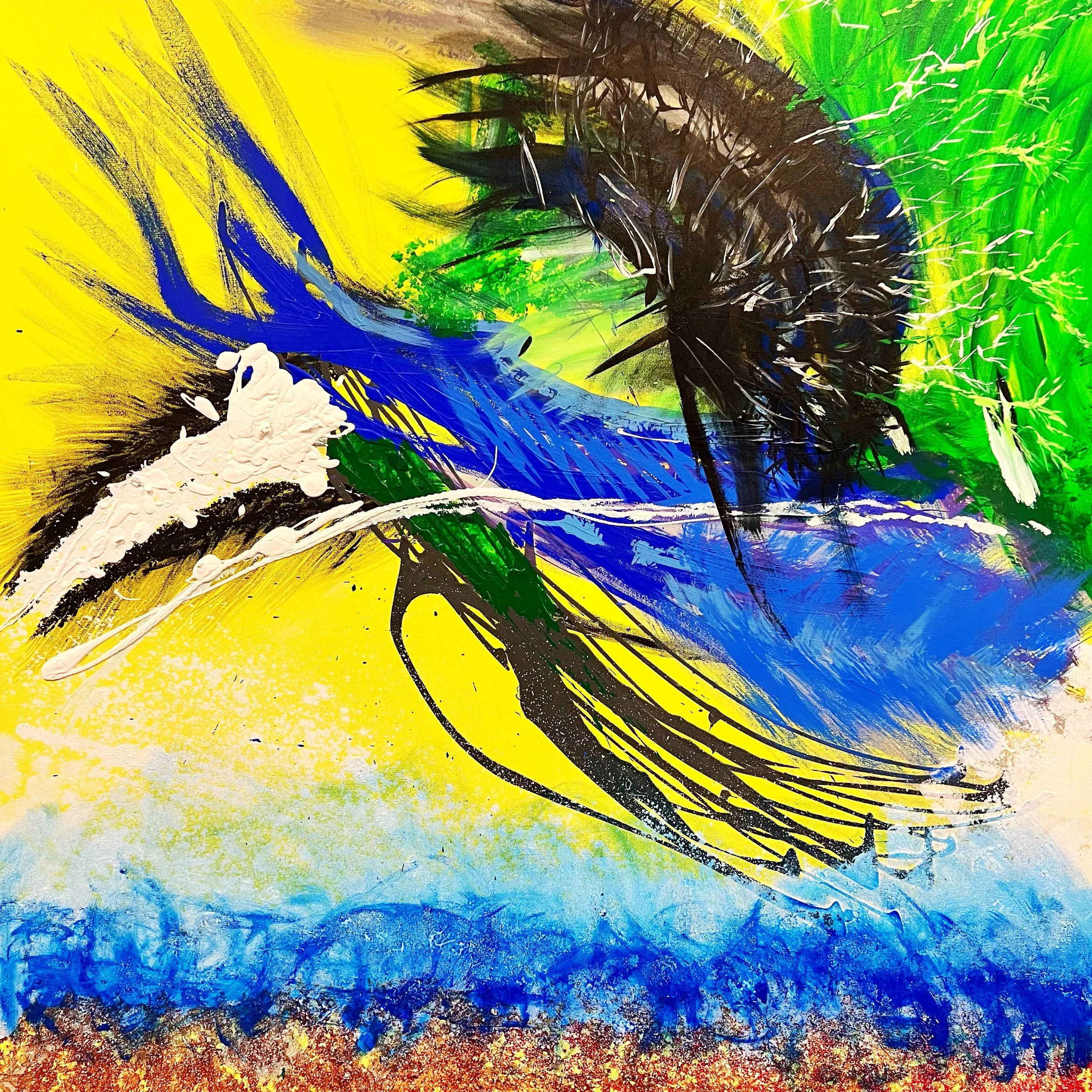 ● Description: A work of energy and motion, grounded by textured earth below. Blue sweeps across yellow, green blends into black, and white strikes through like light breaking open the